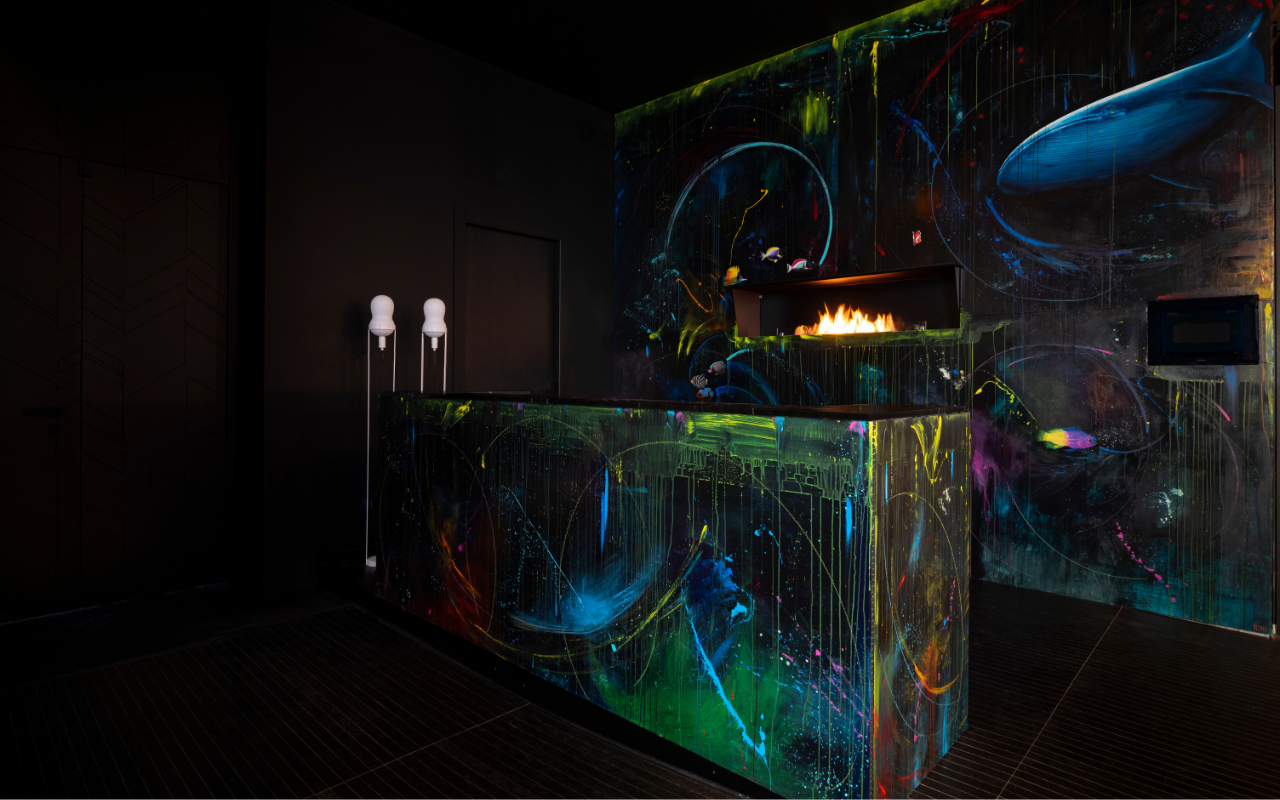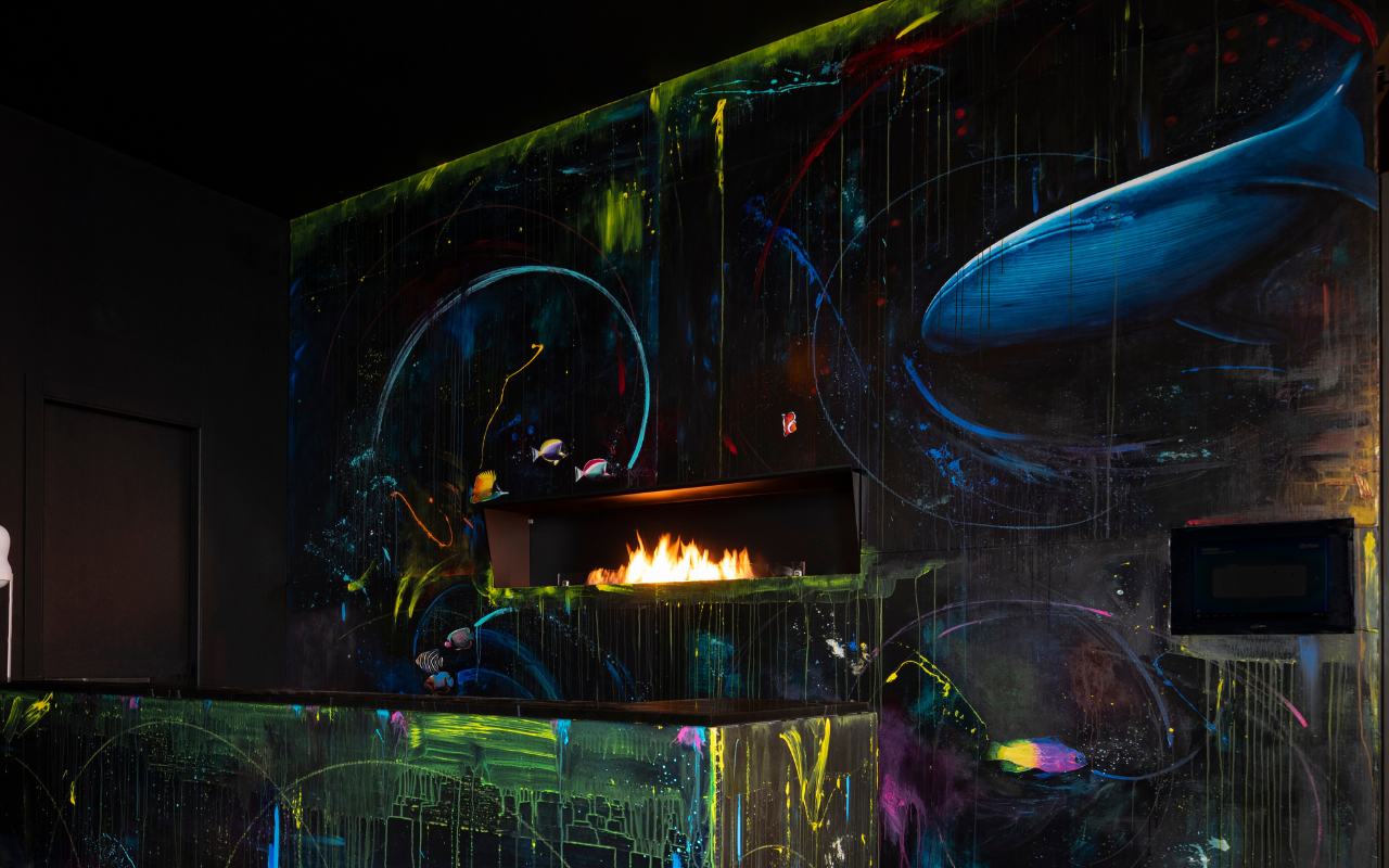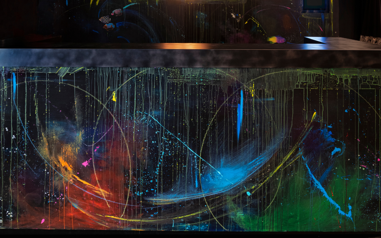 Una parete dipinta con i colori, e le magiche imperfezioni delle profondità marine che convivono con i guizzi e le pennellate della pittrice dando vita alla sua Vandalizzazione.