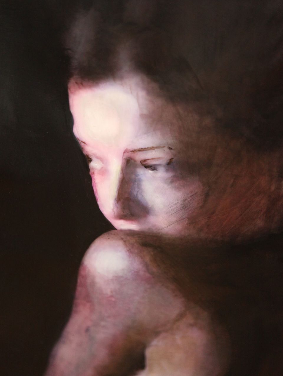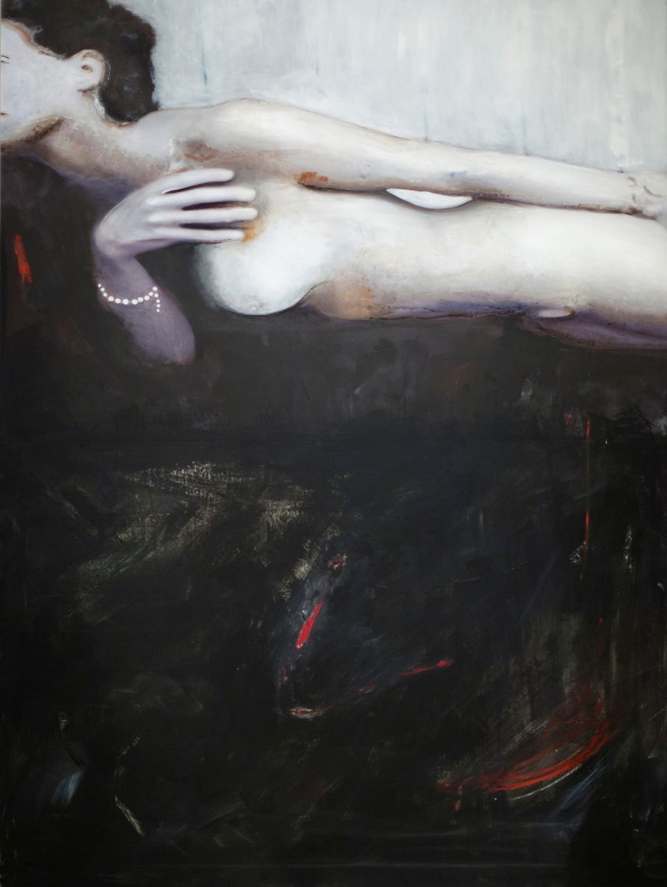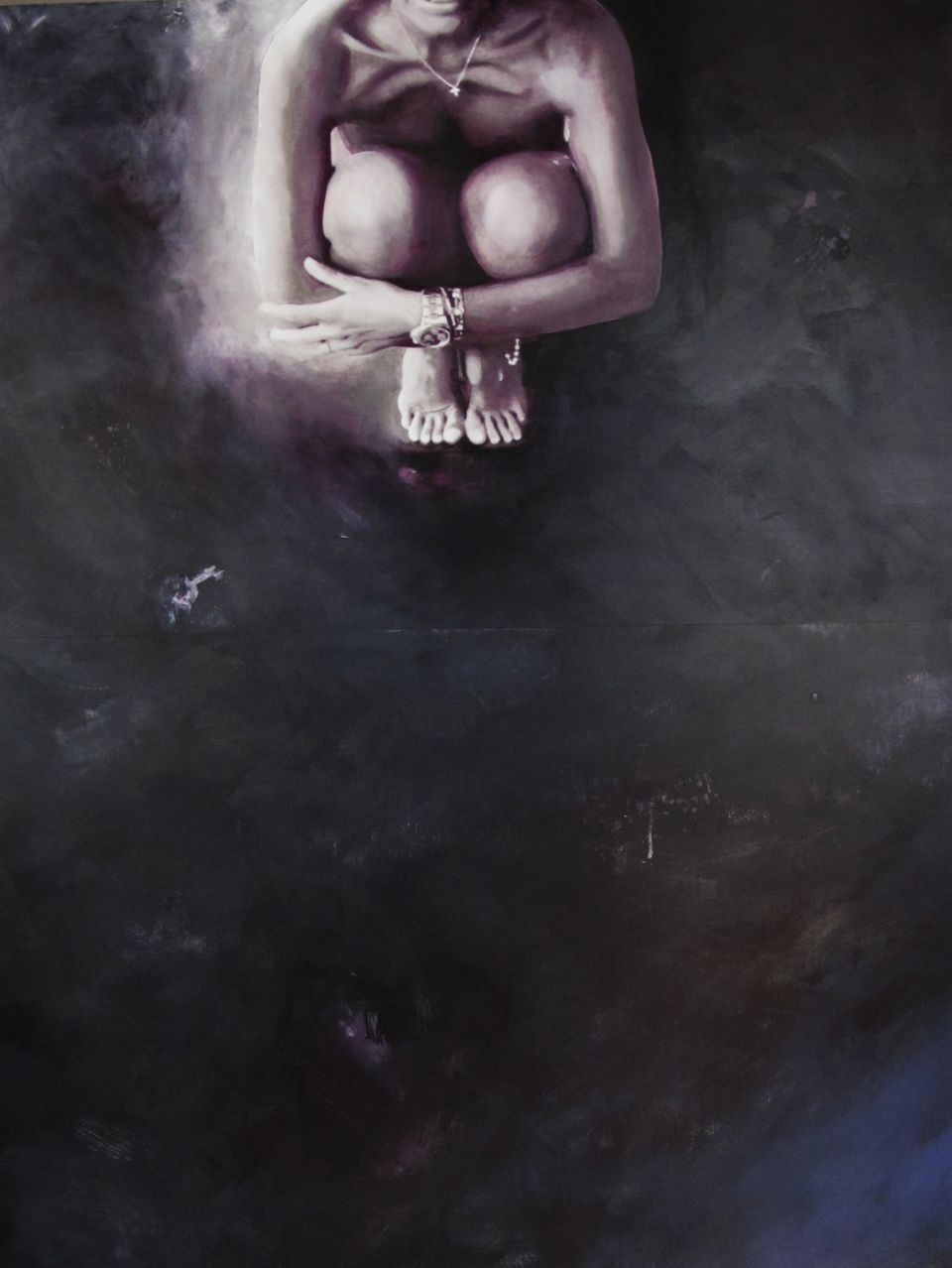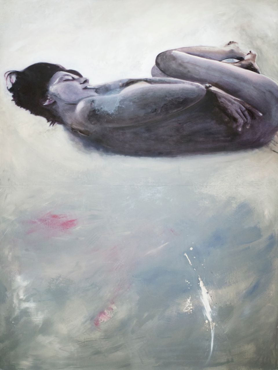Le opere in mostra della serie Alchimia sono legate da un fil rouge fisico: corde rosse uniscono i dipinti per collegarne l’anima trasversalmente. Un approccio unico per la pittrice dove il corpo ha una presenza consistente, una figura che caratterizza ogni quadro con tutte le sfaccettature della personalità umana. Sono presente in prima persona, nudi che esprimono la soggettività di chi li dipinge. Si crea così l’alchimia rievocata dai titoli, una trasmutazione di stato interiore, una catarsi verso l’esterno per potersi rigenerare. “Il mio bisogno di vomitare all’esterno il mio interno. Forza brutale del vomito, che salva, che fa rinascere”.La vandalizzazione del quadro fa parte di questo processo di cambiamento, volto a rendere viva l’opera.